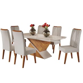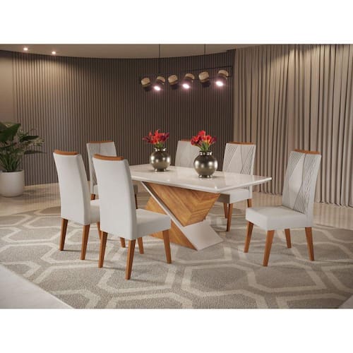 Mesas são indispensáveis para o funcionamento da casa e é no cômodo de confraternização que elas ganham protagonismo. Composto por peças de muito charme, o Conjunto ENCANTARE com cadeira Vegas torna o uso desse móvel importante para garantir uma usabilidade plena para o seu dia a dia. Ideal para cozinhas e salas de jantar. Medida da Mesa (A x L x P): A:82 x L:180 x P:90cm Peso da Mesa: 71,3 kg Mesa suporta até: 50.0000 Acabamento da Cadeira/Banco: Pintura UV Acabamento da Mesa: Pintura UV Ambiente Principal: Sala de Jantar Cadeira/Banco Estofada: Encosto e Assento Estofados Cadeira/Banco estofada: Encosto e Assento Estofados Cadeira/Banco suporta até: 90.0000 codigo_ean: 7909903486160 Complexidade da Montagem: Média: pode ser montado por mais de uma pessoa e/ou necessite de maior conhecimento para montagem Cor: Mel/Marfim/Off White Cor do Produto: Mel/Marfim/Off White De Canto (Canto Alemão): Não Enchimento do Assento: Espuma D-20 Enchimento do Encosto: Espuma D-12 Escala de Brilho: Semi-Brilho Espessura do Tampo: 40 mm Formato do Tampo: Retangular Informações Complementares: Sala de Jantar 6 lugares Itens Inclusos: 1 Mesa, 6 Cadeiras, Kit Ferragem, Manual de Montagem Manual de Montagem e Instalação: https://product-hub-prd.madeiramadeira.com.br/879653/documents/62b92cd2-9f84-4325-bc88-fd0c213538edualdemontagemsalaencantare.pdf Material da Base da Mesa: MDP Material da Estrutura da Cadeira: MDF/Madeira Maciça Material do Tampo: Vidro/MDF Material Principal: MDF/MDP Material Principal das Cadeiras/Bancos: Madeira Maciça Medida da Cadeira/Banco (A x L x P): A:101 x L:41 x P:41cm Medida do Tampo (L x C x E): L:180 x P:90 x E:4cm Mesa Extensível: Não Necessita Montagem: Sim Origem do Produto: Nacional Peso da Cadeira/Banco: 7,25 kg Possui Apoio Para os Pés: Não Possui Vidro: Sim Quantidade de Cadeiras: 6 Quantidade de Lugares: 06 Recomendações de Uso, Manutenção e Limpeza: Limpar com pano levemente umedecido com água Revestimento da Cadeira/Banco: Veludo Sistema de Montagem: Parafusos, cavilhas Tipo de Assento: Fixo Tipo de Encosto: Fixo