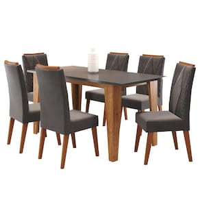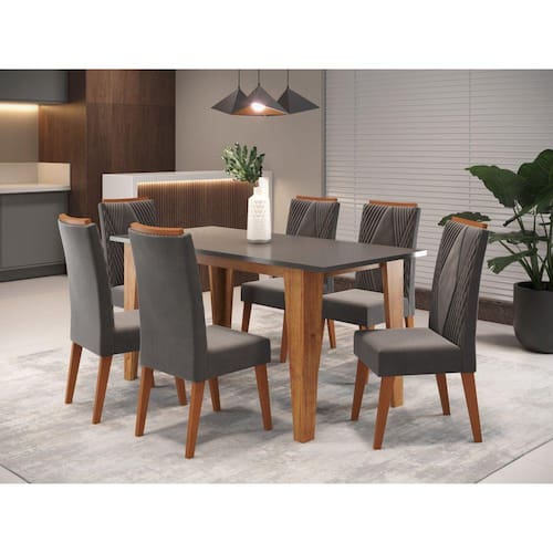 Mesas são indispensáveis para o funcionamento da casa e é no cômodo de confraternização que elas ganham protagonismo. Composto por peças de muito charme, o Conjunto GALES com cadeira VEGAS torna o uso desse móvel importante para garantir uma usabilidade plena para o seu dia a dia. Ideal para cozinhas e salas de jantar. Medida da Mesa (A x L x P): A:79,5 x L:160 x P:80cm Peso da Mesa: 34.1 Mesa suporta até: 50 Acabamento da Cadeira/Banco: Pintura UV Acabamento da Mesa: Pintura UV Acompanha Manual de Instalação: Sim Ambiente Principal: Sala de Jantar Cadeira/Banco estofada: Encosto e Assento Estofados Cadeira/Banco suporta até: 90 Complexidade da Montagem: Média: pode ser montado por mais de uma pessoa e/ou necessite de maior conhecimento para montagem Cor: Mel/Cinza Brilho/Grafite Cor do Produto: Mel/Cinza Brilho/Grafite Cor Secundária: Cinza De Canto (Canto Alemão): Não Enchimento do Assento: Espuma D-20 Enchimento do Encosto: Espuma D-12 Escala de Brilho: Semi-Brilho Espessura do Tampo: 25 Estrutura do Assento: MADEIRA DE EUCALIPTO/ESPUMA Estrutura do Encosto: MDF/MADEIRA Formato do Tampo: Retangular Informações Complementares: Sala de Jantar 6 lugares Itens Inclusos: 1 Mesa, 6 Cadeiras, Kit Ferragem, Manual de Montagem Manual de Montagem e Instalação: https://cdn2.madeiramadeira.com.br/atributo/viero-moveis/1690221-manual-sala-gales.pdf Material da Base da Mesa: MDF/MDP Material da Estrutura da Cadeira: MDF/Madeira Maciça Material do Tampo: MDP Material Principal das Cadeiras/Bancos: Madeira Maciça Medida da Cadeira/Banco (A x L x P): A:101 x L:41 x P:61cm Medida do Tampo (L x C x E): L:160 x P:80 x E:2,5cm Mesa Extensível: Não Necessita Montagem: Sim Origem do Produto: Nacional Peso da Cadeira/Banco: 7.25 Possui Apoio Para os Pés: Não Possui Vidro: Não Quantidade de Cadeiras: 6 Quantidade de Lugares: 06 Recomendações de Uso, Manutenção e Limpeza: Limpar com pano levemente umedecido com água Revestimento da Cadeira/Banco: Veludo Sistema de Montagem: Parafusos, cavilhas