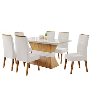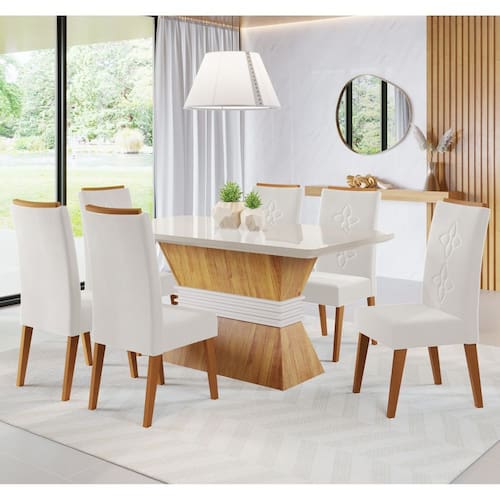 - Material do Tampo: Vidro/MDF - Vidro Temperado: Sim - Possui Vidro: Sim - Pode Ser Montado Invertido?: Não - Necessita de Montagem: Sim - Possui Borda de PVC nas Bordas?: Sim - Pés com regulagem de altura?: Não - Possui Pés?: Sim - Possui Sapatas?: Sim - Possui Rodízios?: Não - Possui Tampo?: Sim - Categoria: Mesa de Jantar 6 Lugares - Peso Suportado no Tampo: 50 kg - Peso Suportado: 90 kg - Revestimento/Acabamento: Pintura UV - Quantidade de Pés: 24 - Garantia (dias): 90 Dias - Recomendação de Manutenção: Utilizar pano levemente umedecido, seguido de pano seco. Não utilizar quaisquer produtos abrasivos. - Observação: Objetos decorativos que aparecem nas imagens, não acompanham o produto. A capacidade de carga considera que o peso está distribuído igualmente pela peça. As cores das imagens podem variar de acordo com as configurações do seu monitor e/ou da iluminação do ambiente onde o produto está inserido. As imagens indicam uma sugestão - Indicação de Uso: Sala de Jantar - Acompanha: KIT DE FERRAGEM E MANUAL DE MONTAGEM - Sistema de Montagem: Parafusos, cavilhas, cola e minifix. - Grau de Dificuldade de Montagem: Médio - Como os Móveis Chegarão em Minha Casa?: Desmontado em caixas, acompanhado de todas as peças, ferragens e manuais para montagem. - Quantidade de Sapatas: 28 - Espessura do Tampo (mm): 40 mm - Material do Tampo: Vidro e MDF - Escala de Brilho: Semi-Brilho - Tecido da Cadeira: VELUDO - Cadeira Estofada: Sim - Material do Encosto: Mdf, Espuma, Madeira - Medidas da Cadeira ( A x L x P ): A:98,5 x L:41 x P:61cm - Possui Puxadores?: Não - Material do Assento: Espuma e Madeira - Altura do Chão até o Assento (cm): 375 - Quantidade de cadeiras por conjunto: 6 - Densidade do Encosto: D-20 - Densidade do Assento: D-20 - Acompanha Cadeiras: Sim - Possui Prateleiras?: Não - Quantidade de Lugares: 6 Lugares - Formato da Mesa: Retangular - Possui Espelho?: Não - Possui Portas?: Não - Possui Gavetas?: Não - Espessura da Estrutura: 15 mm, 25 mm, 40 mm - Material da Estrutura: Mdp, Mdf, Eucalipto