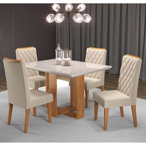 - Material da Estrutura: Mdp e Mdf - Espessura da Estrutura: 25 mm, 40 mm, 50 mm - Possui Gavetas?: Não - Possui Portas?: Não - Possui Espelho?: Não - Possui Prateleiras?: Não - Possui Puxadores?: Não - Escala de Brilho: Semi-Brilho - Possui Tampo?: Sim - Material do Tampo: Vidro e MDF - Espessura do Tampo (mm): 40 mm - Possui Rodízios?: Não - Possui Sapatas?: Sim - Quantidade de Sapatas: 20 - Possui Pés?: Sim - Quantidade de Pés: 16 - Pés com regulagem de altura?: Não - Possui Borda de PVC nas Bordas?: Não - Grau de Dificuldade de Montagem: Médio - Necessita de Montagem: Sim - Sistema de Montagem: Parafusos, cavilhas, cola e minifix. - Pode Ser Montado Invertido?: Não - Como os Móveis Chegarão em Minha Casa?: Desmontado em caixas, acompanhado de todas as peças, ferragens e manuais para montagem. - Categoria: Mesa de Jantar 4 Lugares - Indicação de Uso: Sala de Jantar - Garantia (dias): 90 Dias - Observação: Objetos decorativos que aparecem nas imagens, não acompanham o produto. A capacidade de carga considera que o peso está distribuído igualmente pela peça. As cores das imagens podem variar de acordo com as configurações do seu monitor e/ou da iluminação do ambiente onde o produto está inserido. As imagens indicam uma sugestão - Recomendação de Manutenção: Utilizar pano levemente umedecido, seguido de pano seco. Não utilizar quaisquer produtos abrasivos. - Revestimento/Acabamento: Pintura UV - Cadeira Estofada: Sim - Material do Assento: Mdp e Espuma - Acompanha Cadeiras: Sim - Densidade do Assento: D-26 - Formato da Mesa: Retangular - Quantidade de Lugares: 4 Lugares - Material do Encosto: Mdp, Mdf, Espuma - Densidade do Encosto: D-20 - Material do Tampo da Mesa: Vidro/MDF - Tecido da Cadeira: VELUDO - Peso Suportado no Tampo: 50 kg - Altura do Chão até o Assento (cm): 49 - Possui Vidro: Sim - Medidas da Cadeira ( A x L x P ): A:101 X L:42 X P:58,5CM - Vidro Temperado: Sim - Peso Suportado: 90 kg - Quantidade de cadeiras por conjunto: 4