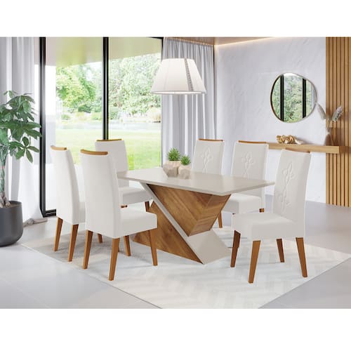 - Pode Ser Montado Invertido?: Não - Possui Borda de PVC nas Bordas?: Não - Pés com regulagem de altura?: Não - Possui Puxadores?: Não - Acompanha Cadeiras: Sim - Possui Prateleiras?: Não - Possui Espelho?: Não - Possui Portas?: Não - Possui Gavetas?: Não - Observação: Objetos decorativos que aparecem nas imagens, não acompanham o produto. A capacidade de carga considera que o peso está distribuído igualmente pela peça. As cores das imagens podem variar de acordo com as configurações do seu monitor e/ou da iluminação do ambiente onde o produto está inserido. As imagens indicam uma sugestão - Possui Pés?: Sim - Possui Sapatas?: Sim - Possui Rodízios?: Não - Possui Tampo?: Sim - Cadeira Estofada: Sim - Necessita de Montagem: Sim - Tecido da Cadeira: VELUDO - Material do Tampo: MDP - Possui Vidro: Não - Vidro Temperado: Não - Categoria: Mesa de Jantar 6 Lugares - Peso Suportado no Tampo: 50 kg - Peso Suportado: 90 kg - Revestimento/Acabamento: Pintura UV - Quantidade de Pés: 24 - Garantia (dias): 90 Dias - Recomendação de Manutenção: Utilizar pano levemente umedecido, seguido de pano seco. Não utilizar quaisquer produtos abrasivos. - Indicação de Uso: Sala de Jantar - Acompanha: Kit ferragem e manual de montagem - Sistema de Montagem: Parafusos, cavilhas, cola e minifix. - Grau de Dificuldade de Montagem: Médio - Como os Móveis Chegarão em Minha Casa?: Desmontado em caixas, acompanhado de todas as peças, ferragens e manuais para montagem. - Quantidade de Sapatas: 30 - Espessura do Tampo (mm): 25 mm - Material do Tampo: MDP - Escala de Brilho: Semi-Brilho - Material do Encosto: Mdf, Espuma, Madeira - Medidas da Cadeira ( A x L x P ): A:98,5 x L:41 x P:61cm - Material do Assento: Espuma e Madeira - Altura do Chão até o Assento (cm): 375 - Quantidade de cadeiras por conjunto: 6 - Densidade do Encosto: D-20 - Densidade do Assento: D-20 - Quantidade de Lugares: 6 Lugares - Formato da Mesa: Retangular - Espessura da Estrutura: 15 mm e 25 mm - Material da Estrutura: Mdp, Mdf, Eucalipto