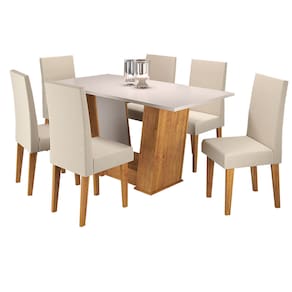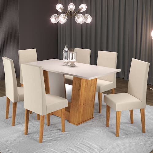 - Acompanha Cadeiras: Sim - Possui Prateleiras?: Não - Possui Espelho?: Não - Possui Portas?: Não - Vidro Temperado: Não - Possui Vidro: Não - Pode Ser Montado Invertido?: Não - Necessita de Montagem: Sim - Possui Borda de PVC nas Bordas?: Não - Pés com regulagem de altura?: Não - Possui Pés?: Sim - Possui Sapatas?: Sim - Possui Rodízios?: Não - Possui Tampo?: Sim - Cadeira Estofada: Sim - Possui Puxadores?: Não - Possui Gavetas?: Não - Categoria: Mesa de Jantar 6 Lugares - Peso Suportado no Tampo: 50 kg - Peso Suportado: 90 kg - Revestimento/Acabamento: Pintura UV - Quantidade de Pés: 24 - Garantia (dias): 90 Dias - Recomendação de Manutenção: Utilizar pano levemente umedecido, seguido de pano seco. Não utilizar quaisquer produtos abrasivos. - Observação: Objetos decorativos que aparecem nas imagens, não acompanham o produto. A capacidade de carga considera que o peso está distribuído igualmente pela peça. As cores das imagens podem variar de acordo com as configurações do seu monitor e/ou da iluminação do ambiente onde o produto está inserido. As imagens indicam uma sugestão - Indicação de Uso: Sala de Jantar - Sistema de Montagem: Parafusos, cavilhas, cola e minifix. - Grau de Dificuldade de Montagem: Médio - Como os Móveis Chegarão em Minha Casa?: Desmontado em caixas, acompanhado de todas as peças, ferragens e manuais para montagem. - Quantidade de Sapatas: 28 - Espessura do Tampo (mm): 25 mm - Material do Tampo: MDP - Escala de Brilho: Semi-Brilho - Tecido da Cadeira: VELUDO - Material do Encosto: Mdf e Espuma - Medidas da Cadeira ( A x L x P ): A:98,5 X L:42 X P:58,5CM - Material do Assento: Mdp e Espuma - Altura do Chão até o Assento (cm): 49 - Quantidade de cadeiras por conjunto: 6 - Densidade do Encosto: D-12 - Densidade do Assento: D-20 - Quantidade de Lugares: 6 Lugares - Formato da Mesa: Retangular - Material do Tampo: MDP - Espessura da Estrutura: 15 mm e 25 mm - Material da Estrutura: Mdp e Mdf