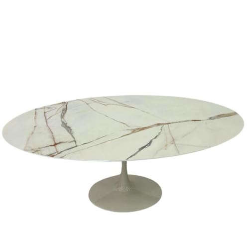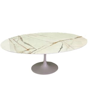 Mesa de Jantar Saarinen Oval, Tampo em Mdf Calacata, com contra tampo em MDF, Base em alumínio fundido com pintura automotiva PU.