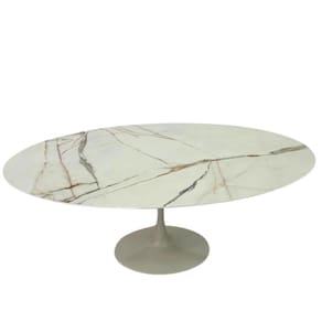 Mesa de Jantar Saarinen Oval, Tampo em Mármore Calacata, com contra tampo em MDF, Base em alumínio fundido com pintura automotiva PU.