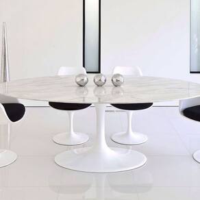 Mesa de jantar Saarinen Oval, Tampo 244x137 cm em Mármore Carrara, com contra tampo em MDF 25 mm, Base em alumínio fundido com pintura automotiva PU.