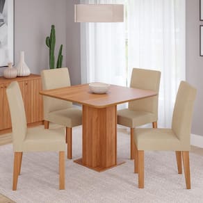 Mesa de Jantar Sophia 95x95 com Tampo em MDF e 4 Cadeiras Maia - Cimol Móveis O Conjunto Sophia com 4 Cadeiras Maia da Cimol Móveis é ideal para quem busca praticidade e estilo em ambientes compactos. A mesa quadrada de 95x95cm possui estrutura em MDF, pintura UV e tampo com bordas chanfradas e acabamento em laca, além de base em formato cruzado com fixação oculta que otimiza o espaço. As cadeiras Maia complementam o conjunto com estrutura em MDF, espuma de alta densidade e revestimento em tecido linho, garantindo conforto e elegância. Perfeito para acomodar até 4 lugares com charme e funcionalidade.
