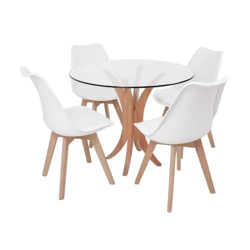 O conjunto é composto por uma mesa de jantar e 4 cadeiras, sendo que a mesa de jantar possui seu tampo confeccionado em Vidro Temperado de altíssima qualidade em formato circular com tamanho de 90,00 (cm) de diâmetro, sua base é confeccionada em madeira de eucalipto garantindo um excelente acabamento ao produto.