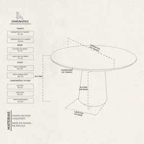 Sistema giratório: MDF esferas de metal Acabamento: Laca Acabamento da Base: Verniz Acabamento do Tampo: Laca Ambiente Principal: Sala de Jantar Atóxico: Não codigo_ean: 7900288205797 Complexidade da Montagem: Baixa: pode ser montado por uma pessoa sozinha Cor: Mel Cor do Produto: Mel Design da Base: Cilindro Dobrável: Não Escala de Brilho: Fosco Espessura do Tampo: 28 mm Extensível: Não Itens Inclusos: 1 Mesa e Kit Ferragens Linha ou Coleção: Araçá Manual de Montagem e Instalação: https://product-hub-prd.madeiramadeira.com.br/603192854/documents/ea415a1a-748e-4081-aac4-87f5bbfcc874ualdemontagemmesaconedocx1.pdf Marca: Árvore de Minas Material da Base: Madeira Maciça Material do Tampo: Vidro/MDF Material Principal: MDF Medida da Base (A x L x P): 75X51X51 Medida da Mesa (A x L x P): 78x110x110 Medida do Tampo (L x C x E): 110X110X2,8 Necessita Montagem: Sim Origem do Produto: Nacional Peso: 35,4 kg Possui Portas: Não Possui prateleira: Não Possui Rodízio: Não Possui Suporte Giratório: Não Possui Vidro: Sim Recomendações de Uso, Manutenção e Limpeza: Limpeza: Utilize pano levemente úmido em seguida pano seco. Nunca use solventes, objetos cortantes ou abrasivos. Sistema de Montagem: Coloque o tampo de vidro em cima da base, centralizado. Parafuse de baixo para cima nos pontos indicados. Suporta Até (kg): 40 kg Tipo de Madeira Maciça da Base: Eucalipto
