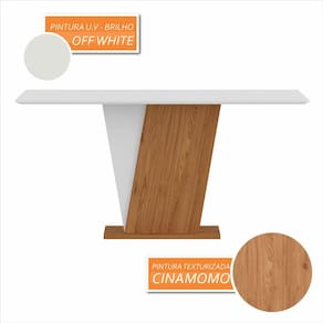 - Material da Base: MDP 15/25mm - Material do Tampo: MDF 25mm - Acabamento: Pintura UV Texturizada/UV Brilho - Tonalidade da Mesa: Cinamomo/Off White - NÃO possui tampo de vidro - NÃO possui cadeiras