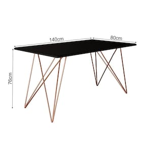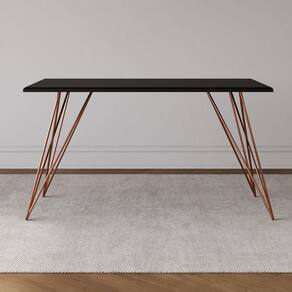 Mesa De Jantar Trama Base Cobre Com Tampo Preto 140 X 80 - Asturias - Cor: Marrom Mesa De Jantar Trama Base Cobre Com Tampo Preto 140 X 80 - New GreenA sua cozinha ou sala de jantar só estará completa com essa maravilhosa mesa para realizar as grandes as refeições em família. E se você busca um móvel com design contemporâneo, acompanhado de muita qualidade material e combinação de cores clássica, o modelo Trama é para você!De tampo retangular e estrutura em ferro, essa mesa acomoda os seus convidados enquanto deixa o momento mais intimista. Mas não é só a sua rotina que ganha uma bela aliada: ela também complementa a decoração com sofisticação, além de ser harmonizável com cadeiras da mesma cor ou coloridas, seja para garantir um visual monocromático ou voltado para algo arrojado. Ah, a peça não acompanha cadeiras e você deve adquiri-las separadamente para deixar o uso completo.Informações importantes:- Os objetos que ambientam as fotos não acompanham o produto.- Verifique as dimensões do produto e certifique-se que o percurso que ele fará até o local de uso permite sua passagem.- Favor verificar se os Pés/Base estão dentro do forro inferior do produto.- Fique atento, nossas cores podem sofrer alterações dependendo do seu monitor.Instruções/Cuidados Limpar com Pano Levemente UmedecidoConteúdo da Embalagem 1 Mesa (Cadeiras não acompanham o produto) - Entregue em: 2 VolumesEspecificações:Modelo: TramaFormato: RetangularTampo: Madeira MaciçaCor do Tampo: PretoPés/Base: Estrutura em Ferro // Tipo: Estrela // FixoCor dos Pés/Base: CobreDimensões: Altura: 76 cm // Largura: 140 cm // Profundidade: 80 cmMesa de Jantar Trama Base Cobre com Tampo Preto 140 X 80 - Asturias