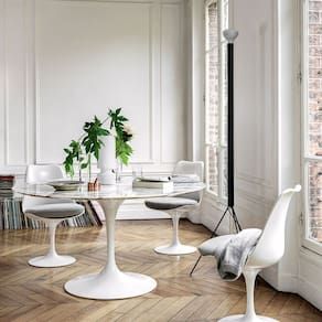A famosa mesa Tulipa é conhecida nacional e internacionalmente devido ao nome do criador, o grande e renomado arquiteto Eero Saarinen, desenhada em 1956, a sua Base lembra o caule da flor Tulipa. O design orgânico desse Mesa faz dela umas das peças mais cobiçadas desde sua criação em 1956, fácil de combinar ela fica bem em qualquer ambiente, na cozinha, na sala, e até como mesa lateral no quarto, a peça inspira versatilidade.