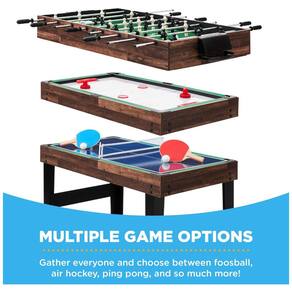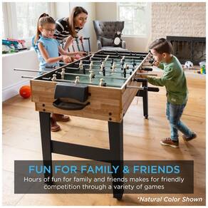 As dimensões gerais da mesa são 121,92 cm de comprimento, 60,96 cm de largura e 79,38 cm de altura, proporcionando um tamanho adequado para diversas configurações de sala. Esta mesa não apenas oferece uma ampla gama de opções de entretenimento, mas também é uma adição funcional e divertida para qualquer espaço dedicado ao lazer em casa.