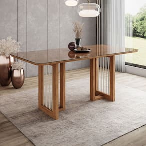 O(a) Mesa de Madeira Yara 160 Cm com Vidro Natural - Henn é produzido em MDF e MDP na escala de brilho Fosco, e possui um grau de dificuldade de montagem: Médio.