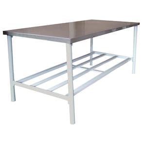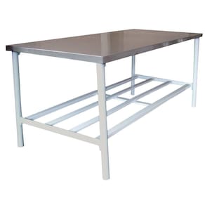 Ideal para Padarias, Açougues e comércios que necessitem de uma Mesa em tampo inox, a Mesa de Manipulação Metalcubas é fabricada em pés tubulares de 2 polegadas em aço carbono SAE 1020 com estrutura revestida em pintura epóxi branca. Sua mesa é produzida em aço inox escovado 430 de 1mm de espessura acompanhando suporte paneleiro em perfil 53mm.