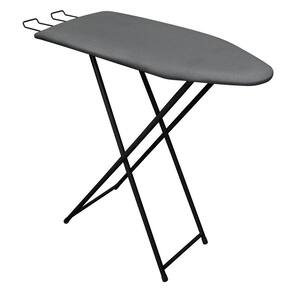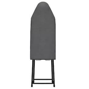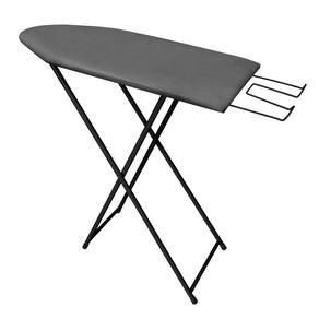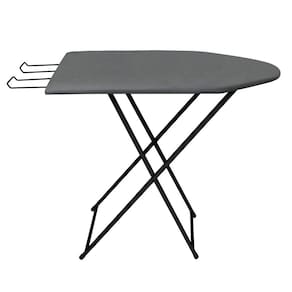 - A Mesa de Passar Loretta conta com tampo em madeira com 34 x 85 cm revestido em tecido metalizado que ajuda a manter o calor do ferro, suporte para ferro de passar e 03 regulagens de altura