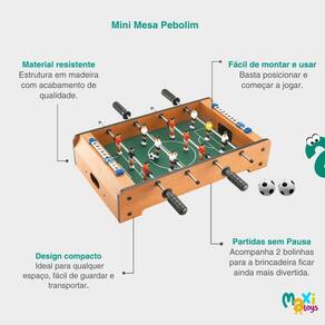 Brinquedo Infantil Mini Mesa de Pebolim em Madeira - Maxi Toys A mini mesa de pebolim da Maxi Toys é uma encantadora interpretação do clássico jogo de futebol de mesa, especialmente projetada para crianças e entusiastas de jogos. Com uma estrutura em madeira de alta qualidade, ela apresenta um toque rústico e elegante. Suas dimensões compactas a tornam perfeita para brincadeiras em mesas pequenas, é fácil de transportar em viagens e ideal para se divertir em qualquer espaço da casa. A superfície do jogo é meticulosamente pintada de verde, imitando um campo de futebol, com detalhes em branco que delineiam as linhas e os gols. Acompanha duas bolas e conta com um marcador de gols, proporcionando uma experiência de jogo completa. Os jogadores, esculpidos em madeira e pintados à mão, exibem cores vibrantes e expressões divertidas, trazendo vida e emoção a cada partida. As hastes são firmes e bem posicionadas, permitindo que as crianças girem e movimentem os jogadores com facilidade, enquanto as manoplas oferecem um excelente grip. O design robusto garante durabilidade, assegurando que a mesa suporte longas horas de diversão. Perfeita para jogos em família, a mini mesa de pebolim da Maxi Toys combina tradição e entretenimento, encantando tanto crianças quanto adultos. Eleve sua diversão com a Mini Mesa de Pebolim da Maxi Baby e comece a marcar golaços Principais Características: - Idade Recomendada: A Partir de 6 anos - Estrutura em Madeira de Qualidade - Super Compacta e Resistente - Jogadores em Madeira Coloridos - Possui Marcador de Gols - Simula um Campo de Futebol de Verdade - Hastes Firmes em Metal - Acompanha 2 Bolas - Estimula habilidades cognitivas como concentração, coordenação e estratégia - Produto Certificado pelo INMETRO Especificações Técnicas: - Conteúdo da Embalagem: 1 Mini Mesa de Pebolim de Madeira Maxi Toys - Dimensões do Produto AxLxP : 10,5 x 31,0 x 51,0 cm aprox. - Composição/Material: Madeira, Metal e Plástico - Peso: 1,800kgs - : 90 dias Contra Defeitos de Fabricação Pelo Fabricante - Certificação: 006824/2025 - Código do Fabricante: 21945 - EAN: 7899403219255 - Marca: Maxi Toys Imagens Meramente Ilustrativas. As cores e estampas podem variar de acordo com o lote do fabricante. Homologação Inmetro: ABCP-BRI-0078-2021-25 Marca: Não Informado