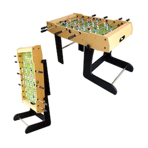 Mesa de futebol Dobrável, confeccionada em MDF é muito resistente, durável e com acabamento em madeira natural de 12mm. Barras em aço cromado de 12,7mm que garante rolagem deslizante. Minis jogadores azuis e vermelhos produzidos em plástico. Prática ocupa espaço mínimo e pode ser dobrada. Diversão e praticidade garantidas