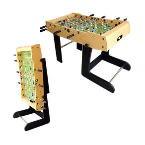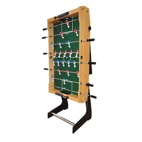 Mesa de futebol Dobrável, confeccionada em MDF é muito resistente, durável e com acabamento em madeira natural de 12mm. Barras em aço cromado de 12,7mm que garante rolagem deslizante. Minis jogadores azuis e vermelhos produzidos em plástico. Prática ocupa espaço mínimo e pode ser dobrada. Diversão e praticidade garantidas