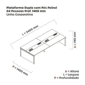 Mesa corporativa para 4 lugares com pé painel adequado para ambientes de coworking. Esse complemento é projetado para ser utilizado em conjunto com outras mesas, permitindo aumentar o número de lugares disponíveis. Ela combina funcionalidade e estilo, proporcionando um espaço colaborativo confortável para trabalhar. Você pode adicionar essa mesa a outras unidades para criar um ambiente expansível conforme necessário. Acompanha Manual de Instalação: Sim Ambiente Principal: Escritório Complexidade da Montagem: Baixa: pode ser montado por uma pessoa sozinha Cor: Grafito/Cinza Cor da Base: Cinza Cor do Produto: Grafito/Cinza Cor do Tampo: Cinza Cor Flex: Não Cor Interna: Grafito/Cinza Dobrável: Não Escala de Brilho: Semi-Fosco Espessura do Tampo: 25 mm Formato: Retangular Itens Inclusos: 1 mesa plataforma dupla 2 lugares Linha ou Coleção: Linha Corporativa Manual de Montagem e Instalação: https://product-hub-prd.madeiramadeira.com.br/900658/documents/640d482e-7e58-4be9-9e01-62fa93a6390220Dupla200420PC3A920Painel.pdf Material da Estrutura: Aço Material do Tampo: MDP Material dos Pés: Polipropileno Material Principal: MDP Montagem Flex: Não Necessita Montagem: Sim Origem do Produto: Nacional Peso: 86,686 kg Possui Painel: Não Possui Passa Cabos: Não Possui Porta Objetos: Não Possui Portas: Não Possui Prateleiras: Não Possui suporte para CPU: Não Possui Suporte para Teclado: Não Possui Vidro: Não Recomendações de Uso, Manutenção e Limpeza: Utilize pano úmido com para limpeza Sapatas Niveladoras: Sim Sistema de Montagem: Parafuso Suporta Até (kg): 30 kg