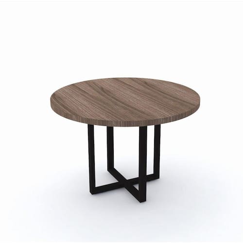 - Mesa de reunião redonda, com tampo em madeira (MDP) e base tubular com pés niveladores.