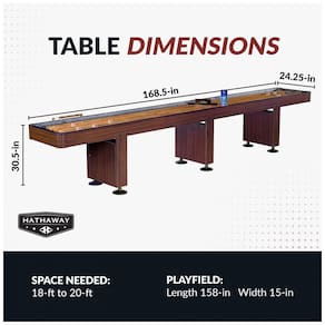 A mesa de shuffleboard Hathaway Challenger é projetada para uso recreativo em casa ou salas de jogos familiares, permitindo partidas para 2 a 4 jogadores adultos com discos azuis e vermelhos. O campo de jogo possui bloco de açougueiro em madeira maciça de 3,8 cm de espessura, unido por dedos e revestido com poliuretano para deslize suave dos discos. Mede 427 cm de comprimento por 61,6 cm de largura e 77,5 cm de altura, com gabinete em MDF laminado nogueira, bisagras de bronze antigo e cantos reforçados em compensado.