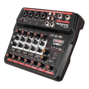 Mesa de Som Compacta Soundvoice MC6 Bt Esta é uma mesa de som de 6 entradas 4 combo P10 /XLR com alimentação Panthom Power e + 2 entradas P10 L/R, entrada usb frontal para pendrive por onde poderá ouvir músicas ou gravar diretamente no pendrive, conexão Bluetooth, efeito delay, e ainda tem agregado a ela uma interface usb traseira para ouvir seus áudios favoritos de seu computador, com o controle total de volumes e saídas padrões para interligações em amplificadores e caixas de som externas, ou gravar e transmitir através do computador.