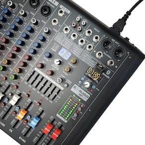 Mesa de som k-audio mp1210 12 canais - mixer analógicos de alto desempenho com efeitos integrados equalizador paramétrico de 3 bandas low - grave 100hz / mid - médios / 1khz / high - agudo 10khz ajuste do pré amplicador por canal gain 2 saídas trs aux send 1 saída dedicada para máquina de efeito por canal máquina de efeitos composto por 16 preset e ajustes controle de pan por canal left / right mute e controle de volume por fader de 60mm 48v power botão de acionamento do 48v divididos por grupo entradas tipo rca com controle de volume por fader 60mm 2 buses de grupo saídas tipo rca para gravação -equalizador gráco de 7 bandas para ajuste da saída master ou subgrupos saída xlr main out -saída trs main out vu saída meterbridge standard saída trs dedicada ao uso de fones de ouvido porta usb 2.0 para conexão de pendrive com áudios em mp3 conexão bluetooth para reprodução através de equipamento portátil Homologação Anatel: 007892012769 Marca: Não Informado