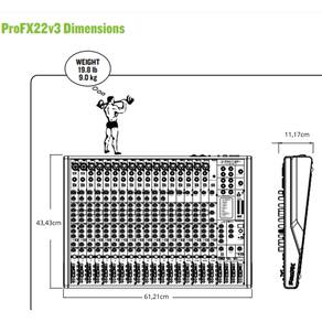 A ProFX22v2 (v2 ou v3) é uma mesa de som profissional da Mackie, com 22 canais, ideal para mixagem ao vivo, gravação e criação de conteúdo. Ela oferece recursos como pré-amplificadores de microfone, efeitos integrados (reverbs, chorus, delays), equalizador gráfico de 7 bandas e interface USB para gravação e reprodução de áudio.