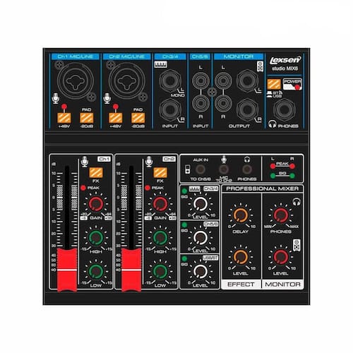 - marca: lexsen; - modelo: studio mix 6; - 6 canais; - canais de entrada: 2x combo xlr + p10; - entrada mp3; - entrada usb 2.0; - conexão bluetooth; - canais de saída: l/r (xlr), p10; - saída auxiliar p2; - fx integrado com 2 botões; - eq/2-bandas; - led peak; - resposta de frequência: 20hz - 20khz 1db + 4dbu - 1khz; - distorção harmônica total: 0.5% + 4dbu 22hz - 22khz; - phantom power + 48v; - alimentação usb opcional; - tensão: dc 5v 1a/2.0; - potência: 7w.