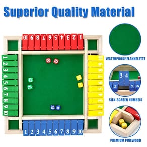 JOGOS DE FAMÍLIA ENGRAÇADOS - Na verdade, a felicidade é tão simples. Através da Nicecho feche a caixa, deixa você viciado e dá ao seu cérebro uma boa provocação, deixando você fisgado por horas, e oferecendo a você uma maneira perfeita de vencer o tédio. regras simples do jogo, aproveite os momentos emocionantes do jogo. - JOGOS DE FAMÍLIA ENGRAÇADOS - Na verdade, a felicidade é tão simples. Através da Nicecho feche a caixa, deixa você viciado e dá ao seu cérebro uma boa provocação, deixando você fisgado por horas, e oferecendo a você uma maneira perfeita de vencer o tédio. regras simples do jogo, aproveite os momentos emocionantes do jogo. - Design de qualidade premium - Feche a caixa feita de madeira de pinho maciça. O design da superfície de feltro reduz o ruído quando o jogo de tabuleiro está acontecendo. Durável, resistente a riscos e ecológico. Quatro cores diferentes de dados de tecnologia de serigrafia acrílica para garantir o uso prolongado. - Aprendizagem e ferramentas sociais - não é apenas um jogo de matemática, para promover a capacidade de aprendizagem das crianças de adição, subtração, multiplicação e divisão, mas também um tipo de entretenimento social, que pode desenvolver um senso de regras e exercitar sua capacidade de pensamento, capacidade lógica e capacidade de reação de uma maneira interessante. - Portátil e prático - o tamanho da caixa é de 30,5 x 30,5 x 3,7 cm. Pode ser facilmente transportado para qualquer atividade ao ar livre. Perfeito para casa, sala de aula, festas, piqueniques, aniversário e bares. Crie suas próprias regras e aproveite o jogo quando e onde quer que esteja. - Serviço íntimo - Shut The Box é um ótimo jogo para famílias e amigos de todas as idades. Se por algum motivo você não estiver 100% satisfeito, informe-nos e nossa equipe de atendimento ao cliente o ajudará a DEVOLVER OU REEMBOLSAR.