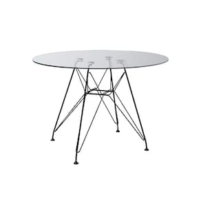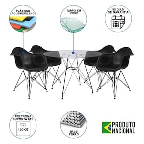 Mesa De Vidro Redonda Eames Eiffel 90cm Com 4 Poltronas Pretas Ferro PretoO Conjunto de Mesa Eames Eiffel e Poltrona Daw se destaca pelo design moderno e sofisticado. Com base em ferro que confere total resistência, garantindo melhor durabilidade, sendo uma ótima escolha para quem busca conforto e design único.Tipo: ConjuntoModelo: DawCor do Tampo: VidroCor do Assento: PretoCARACTERÍSTICASAssento: PolipropilenoTampo: PretoBase: FerroGarantia: 90 DiasDIMENSÕES DA POLTRONAAltura: 80cmAssento até o chão: 40cmBraço do assento até o chão: 65cmLargura: 38cmComprimento: 38cmSuporta até: 120kgDIMENSÕES DA MESAAltura: 76cmDiâmetro: 90cmRECOMENDAÇÕESLimpeza: Utilize um pano macio levemente úmido.Necessita montagem.ATENÇÃOAS IMAGENS SÃO MERAMENTE ILUSTRATIVAS E PODEM SOFRER VARIAÇÕES DE COR E PEQUENOS DETALHES DE ACORDO COM O SEU MONITOR, ILUMINAÇÃO DO AMBIENTE E ATÉ MESMO A SUA PERCEPÇÃO VISUAL.