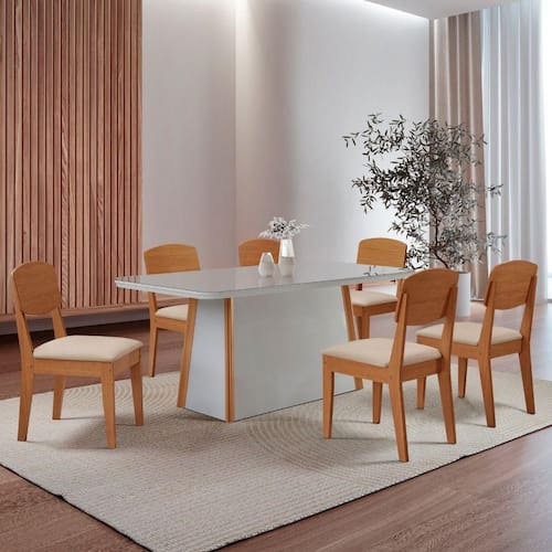 A cadeira Copper, com encosto em MDF e Assento Estofado, oferece Conforto e suporte ideais. O conjunto e uma escolha que agrega sofisticacao e praticidade a qualquer ambiente.