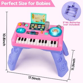 - Mesa DJ multifuncional para bebês com toca-discos iluminado, 24 teclas de piano, 8 sons de instrumentos e 3 efeitos sonoros de celular.
