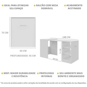A Mesa Dobrável Armário de Cozinha Ibiza Multimóveis é produzida em MDP com acabamento acetinado (cerca de 20% de brilho), que garante maior durabilidade, além de um acabamento superior. Prático e funcional, possui 3 prateleiras (suportam 6 Kg cada) para manter o seu ambiente organizado e você ainda pode utilizar como mesa. Para facilitar o manuseio, possui 4 rodízios internos, que tornam a abertura mais leve. Seu design minimalista, torna o móvel muito versátil, podendo ser utilizado de diversas maneiras e em qualquer ambiente.