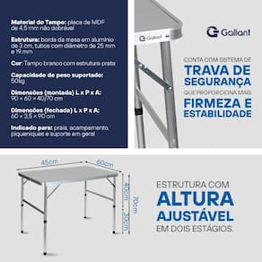 A Mesa Dobrável de Alumínio Gallant 90x60cm foi projetada para quem busca funcionalidade, leveza e durabilidade no dia a dia. Compacta e fácil de transportar, ela é ideal para passeios, acampamentos, piqueniques, áreas de lazer e pequenos ambientes, proporcionando um espaço prático e estável sempre que necessário.