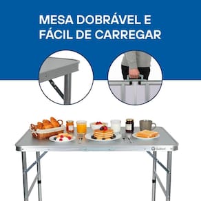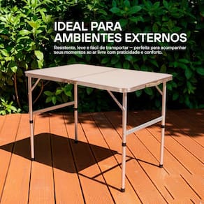Com estrutura em alumínio reforçado e tampo dobrável em MDF de 4,5 mm, a mesa combina resistência e acabamento sofisticado. Seu design versátil permite ajustar a altura entre 40 e 70 cm, adaptando-se a diferentes usos: desde um apoio para refeições até uma mesa auxiliar para atividades externas.