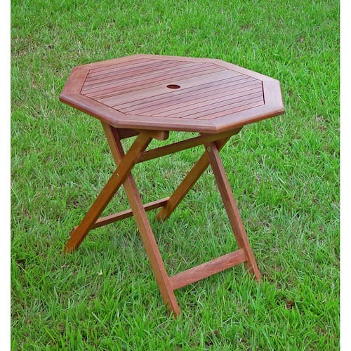 Feito de madeira de acácia com acabamento corado a óleo que dá a aparência clássica de madeira. A mesa octogonal tem orifício no centro para um guarda-chuva. Pode ser dobrada para facilitar o armazenamento. Especificações: Item montado Dimensões Comprimento (cm): 76 Item montado Dimensões Largura (cm): 76 Item montado Dimensões Altura (cm): 71 Item montado Dimensões Altura (cm): 71 Peso montado no item (LBS): 46