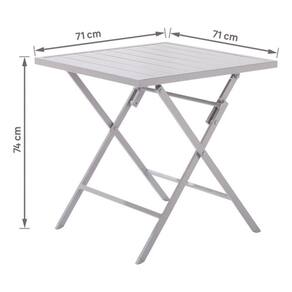 Esta mesa de jardim tem um formato quadrado, com dimensoes de 71x71x74cm, acomodando confortavelmente ate dois lugares. O tampo de mesa e a estrutura sao feitos de aluminio, um material resistente a ferrugem e facil de limpar. Alem disso, a mesa e dobravel, o que facilita o armazenamento e a movimentacao, tornando-a uma escolha pratica para espacos pequenos ou para aqueles que gostam de reorganizar seu mobiliario regularmente.