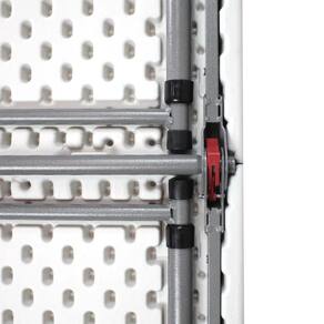 A mesa é fabricada em polietileno de alta densidade, garantindo resistência e durabilidade superiores. A presença de uma trava de segurança garante a estabilidade do tampo, enquanto os pés contam com um acabamento emborrachado anti-deslize, proporcionando estabilidade mesmo em terrenos irregulares.