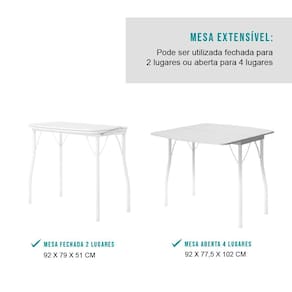 A Mesa Extensível Carraro é a solução perfeita para quem precisa de espaço e quer aproveita-lo da melhor forma. Consegue proporcionar comodidade para acomodar de duas até quatro pessoas, já que conta com a possibilidade de utilizar a mesa aberta ou fechada. Além disso, facilita o dia a dia deixando livre a área de circulação do ambiente.Especificações Mesa:Medidas mesa fechada: Largura: 92 cm | Altura: 79 cm | Profundidade: 51 cmMedidas mesa aberta: Largura: 92 cm | Altura: 77,5 cm | Profundidade: 102 cmPeso: 13,59 KgEstrutura: Tubos de açoTampo: MDPPonteira: PlásticaPeso suportado: Até 30 Kg