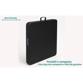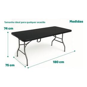 Especificações: Dimensões: Aberta: 180 cm (comprimento) x 70 cm (largura) x 74 cm (altura) Fechada: 94 cm (comprimento) x 70 cm (largura) x 7,5 cm (altura) Peso: Aproximadamente 12 kg Composição: Tampo: Polietileno de alta densidade (HDPE), resistente e fácil de limpar Estrutura: Aço com pintura epóxi anticorrosiva Pés: Antiderrapantes, para maior estabilidade Carga máxima suportada: 100 kg (distribuídos uniformemente) Cor: Preta