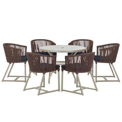 Combinando estilo e resistencia, esta Mesa e cadeiras traz o melhor do design contemporaneo em aluminio com micro pintura e acabamento em corda nautica. O Estofado impermeavel completa o conforto e a funcionalidade, tornando-a ideal para ambientes externos e internos.