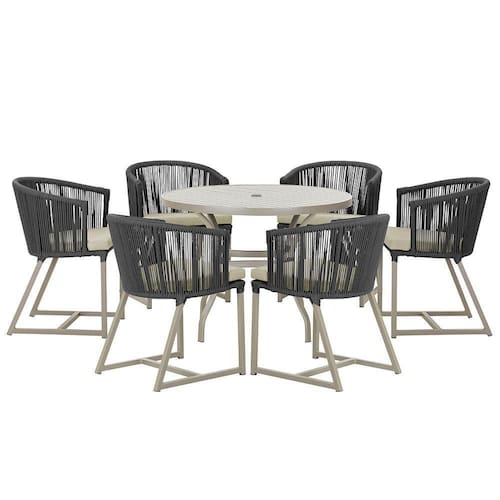 Combinando estilo e resistencia, esta Mesa e cadeiras traz o melhor do design contemporaneo em aluminio com micro pintura e acabamento em corda nautica. O Estofado impermeavel completa o conforto e a funcionalidade, tornando-a ideal para ambientes externos e internos.