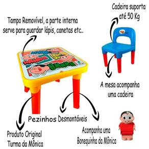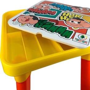 A Mesa Infantil Turma da Mônica com cadeira, tem tampo removível para guardar objetos e compartimento interno com divisórias, vem com Bonequinha do MonicaMesinha e cadeira são desmontáveis