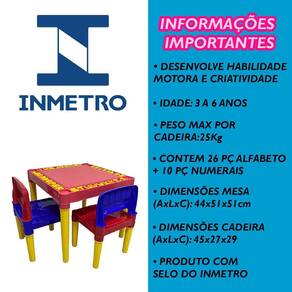 Informações importantes: - idade recomendada: 3 a 6 anos - peso máximo suportado por cadeira: 25 kg - contem 26 letras do alfabeto + 10 números - dimensões da mesa axlxc : 44x51x51cm - dimensões da cadeira axlxc : 45x27x29cm - produto com selo de inmetro