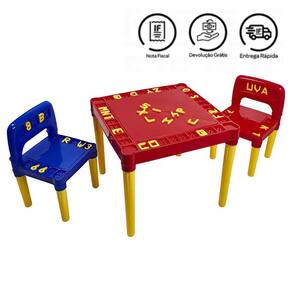 Características: - estimula as habilidades psicomotoras, criatividade e imaginação das crianças. Auxiliando no aprendizado dos números e das letras. - as cores do produto podem variar de acordo com o lote de fabricação e imagem apresentada. - a mesa e as duas cadeiras possuem pés e encosto coloridos e as letras e números são amarelos. - garantia: 03 meses contra defeitos de fabricação. - imagens ilustrativas.