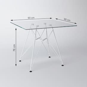 Mesa Eiffel Quadrada 90cm Tampo De Vidro Com Base De Ferro BrancoA Mesa Eiffel é a escolha ideal para deixar sua casa muito mais bonita e renovada. Essa mesa tem em sua estrutura materiais de altíssima qualidade, que proporciona muito mais resistência, mesmo com o passar dos anos. Ela tem formato quadrado e possui espaço para 4 lugares, o que é ideal para um jantar em família. A mesa é versátil e combina com vários tipos de decoração, o que dá mais praticidade em casa.Tipo: MesaModelo: EiffelCor: VidroDimensões do Produto- Altura: 76cm- Largura: 90cm- Profundidade: 90cmCaracterísticas- Base: ferro entrelaçado branco- Tampo de Vidro- Necessita Montagem? Parcialmente (Produto Entregue Montado Parcialmente)Mesa Eiffel Quadrada 90cm Tampo de Vidro com Base de Ferro Branco