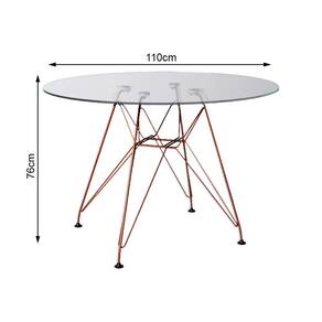 Mesa Eiffel Redonda 110cm Tampo De Vidro Com Base De Ferro Cobre A Mesa Eiffel é a escolha ideal para deixar sua casa muito mais bonita e renovada. Essa mesa tem em sua estrutura materiais de altíssima qualidade, que proporciona muito mais resistência, mesmo com o passar dos anos. Ela tem formato redondo e possui espaço para 4 lugares, o que é ideal para um jantar em família. A mesa é versátil e combina com vários tipos de decoração, o que dá mais praticidade em casa.