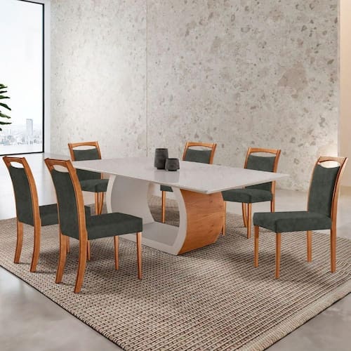 Com o Conjunto Mesa Ellis e Cadeira Munique, voce cria um ambiente de sofisticacao e conforto, perfeito para jantares e momentos especiais em sua casa.