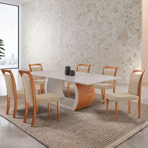 Com o Conjunto Mesa Ellis e Cadeira Munique, voce cria um ambiente de sofisticacao e conforto, perfeito para jantares e momentos especiais em sua casa.
